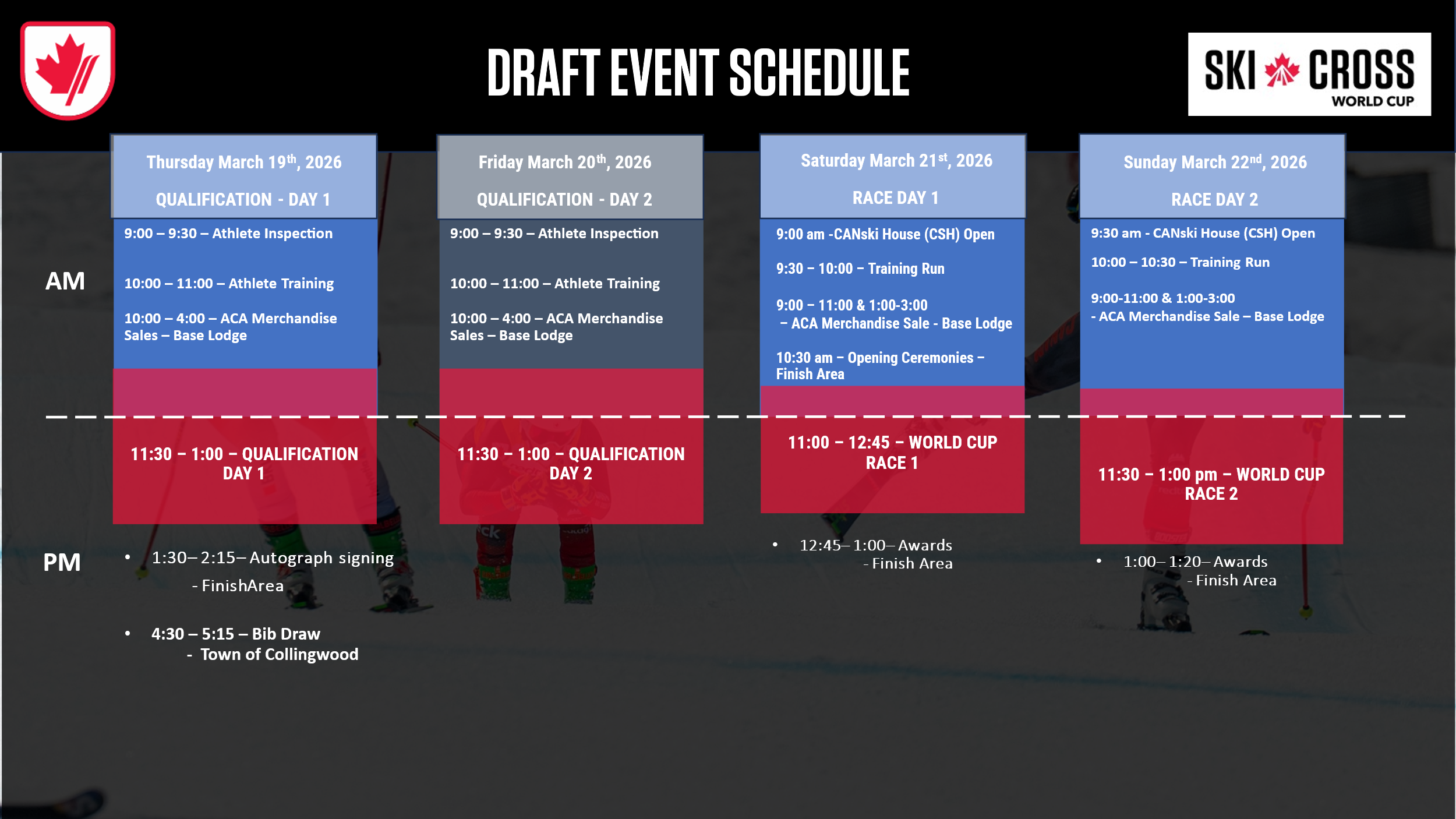 Get ready for the excitement of the FIS Ski Cross World Cup at Craigleith Ski Club! From March 20-22, 2026, witness elite athletes from around the globe compete on the thrilling slopes of Ontario’s premier ski venue. Don’t miss your chance to experience world-class racing, family-friendly activities, and an unforgettable weekend of winter sports.